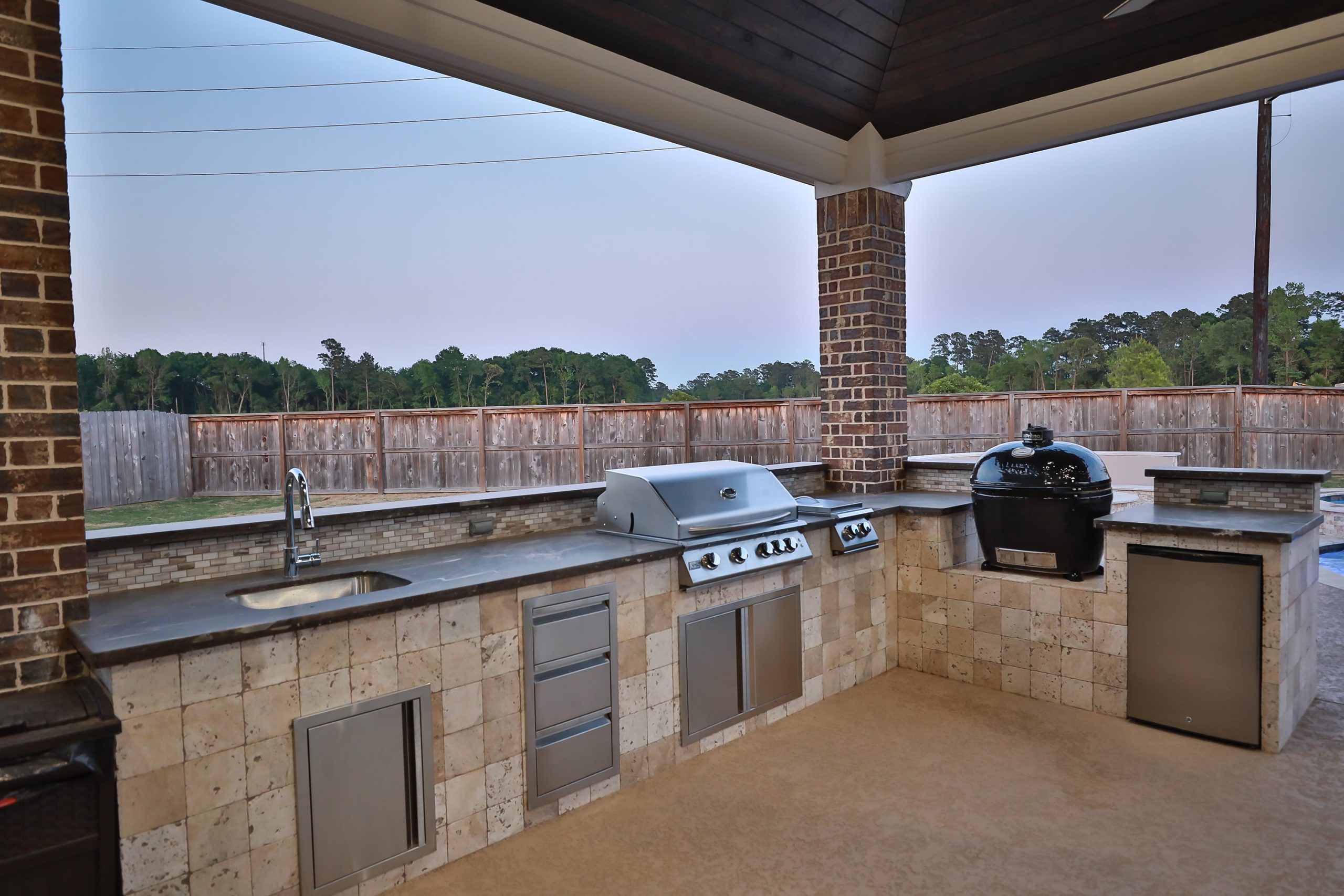 This North Houston home had a wonderful large backyard. The homeowners were eager to make good use of the space to create a backyard they could relax and entertain in. They wanted a design they could grow with and that supported their active lifestyle. They envisioned a beautiful new pool and large decking area. They also liked the idea of having a poolside seating area as well as a covered patio extending from the home. An outdoor kitchen was a must. They also wanted to leave plenty of open green space for pets and kids to enjoy.
