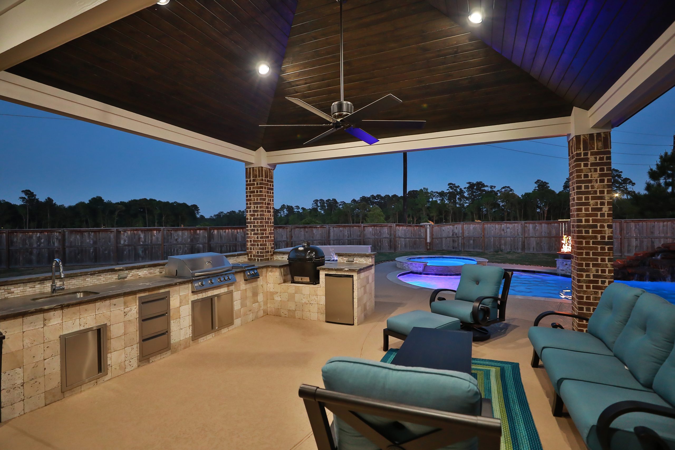 A large covered patio was built onto the back of the home, giving space for an outdoor living area next to an outdoor kitchen.